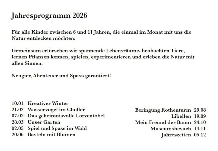Wir freuen uns wenn wir euch mit unserer Begeisterung für die einheimische Tier- und Pflanzenwelt anstecken können. Die Welt vor der Haustür wartet darauf entdeckt und erforscht zu werden. Dürfen wir auch Ihre Kinder und die Kinder Ihrer Freunde und Verwandten bald bei uns begrüssen?